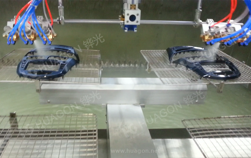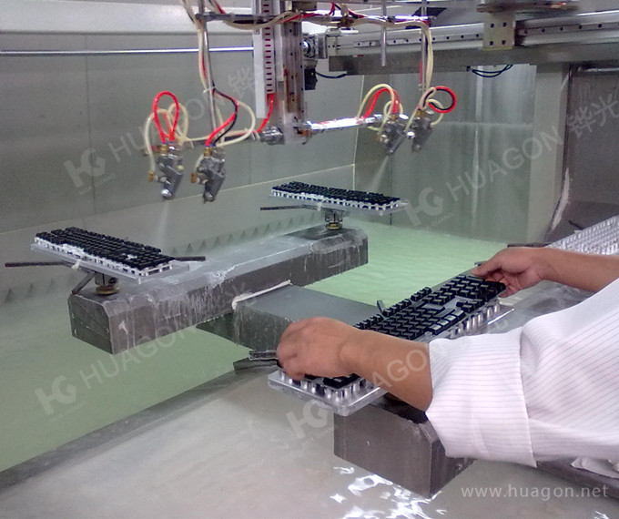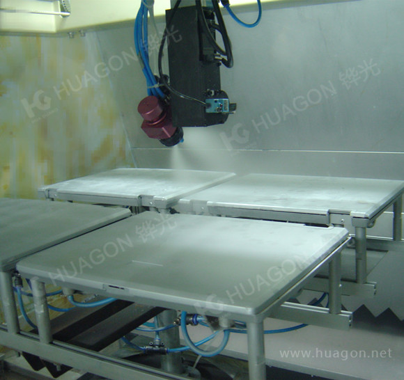 上料-手動靜電除塵-素材預熱-手工放料-自動噴涂-靜置-隧道式烘烤-冷卻-下料